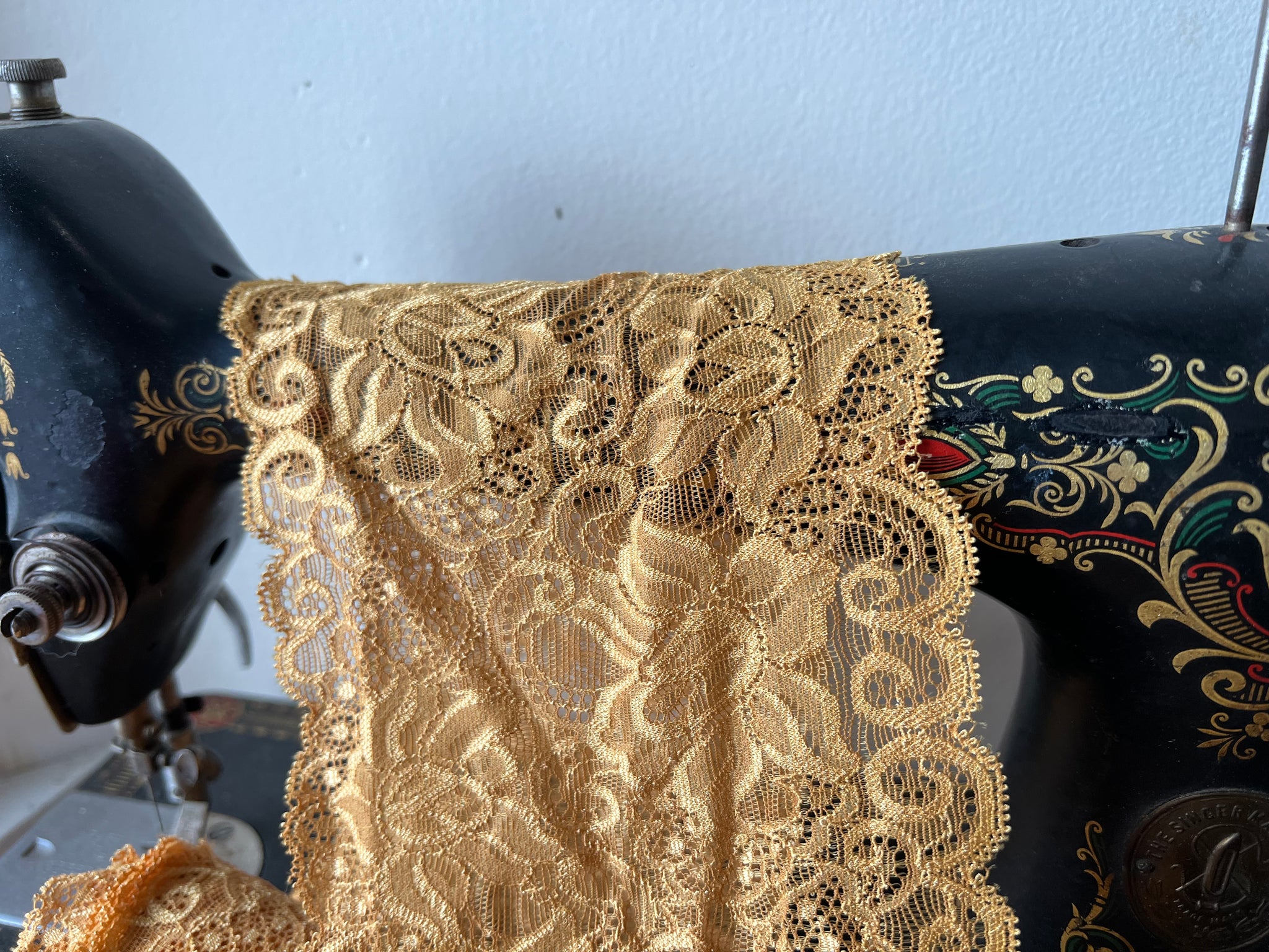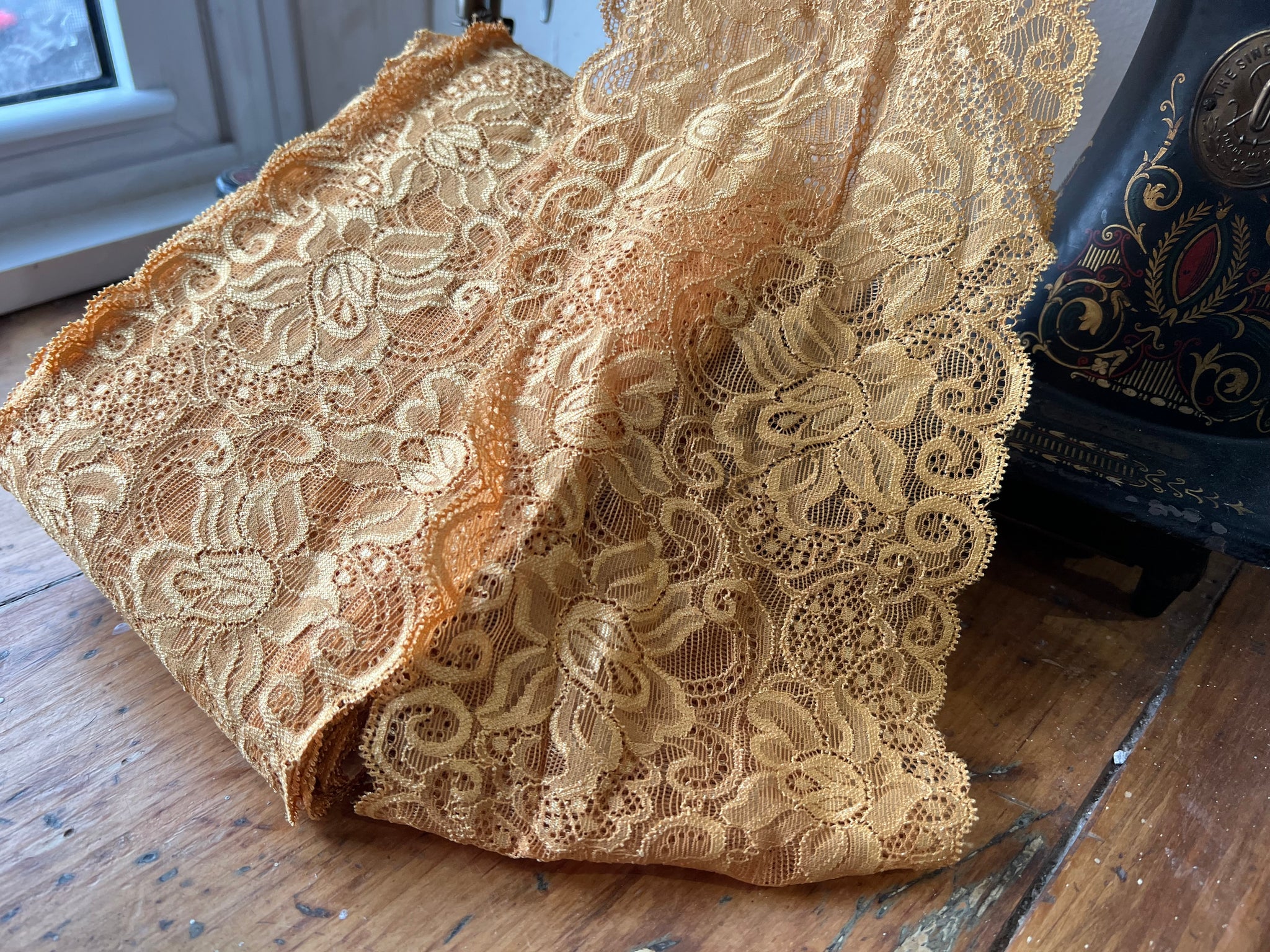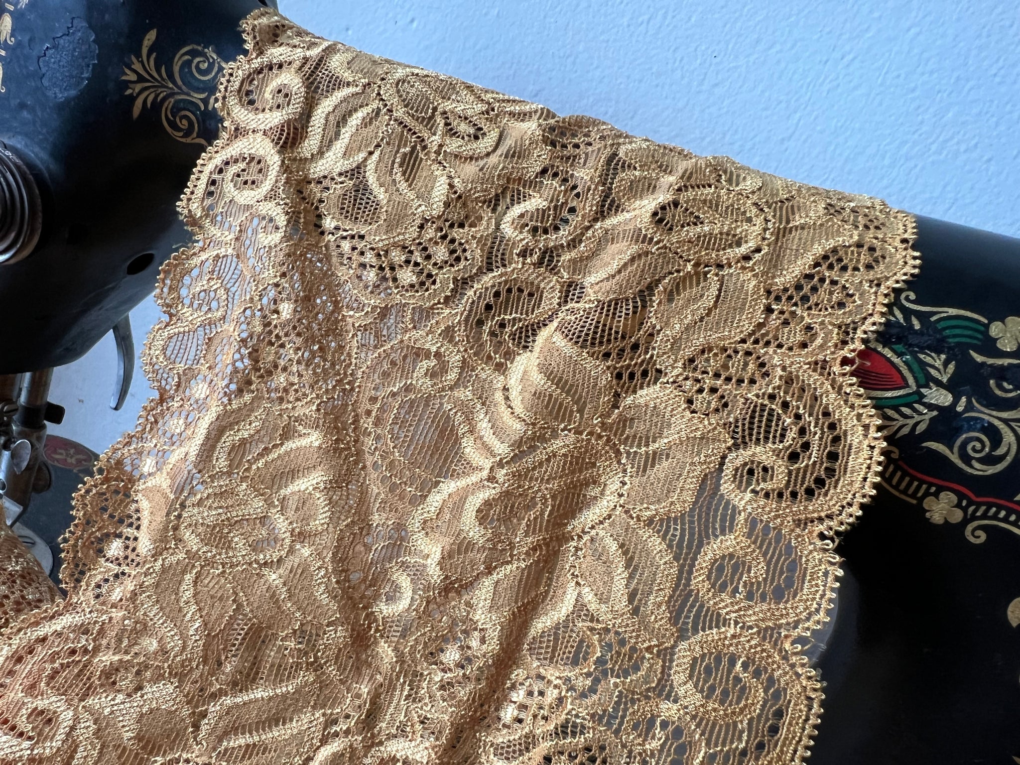 This Five & a Half Inch Gold Stretch Lace features a beautiful Gold floral design on a vibrant gold background.
