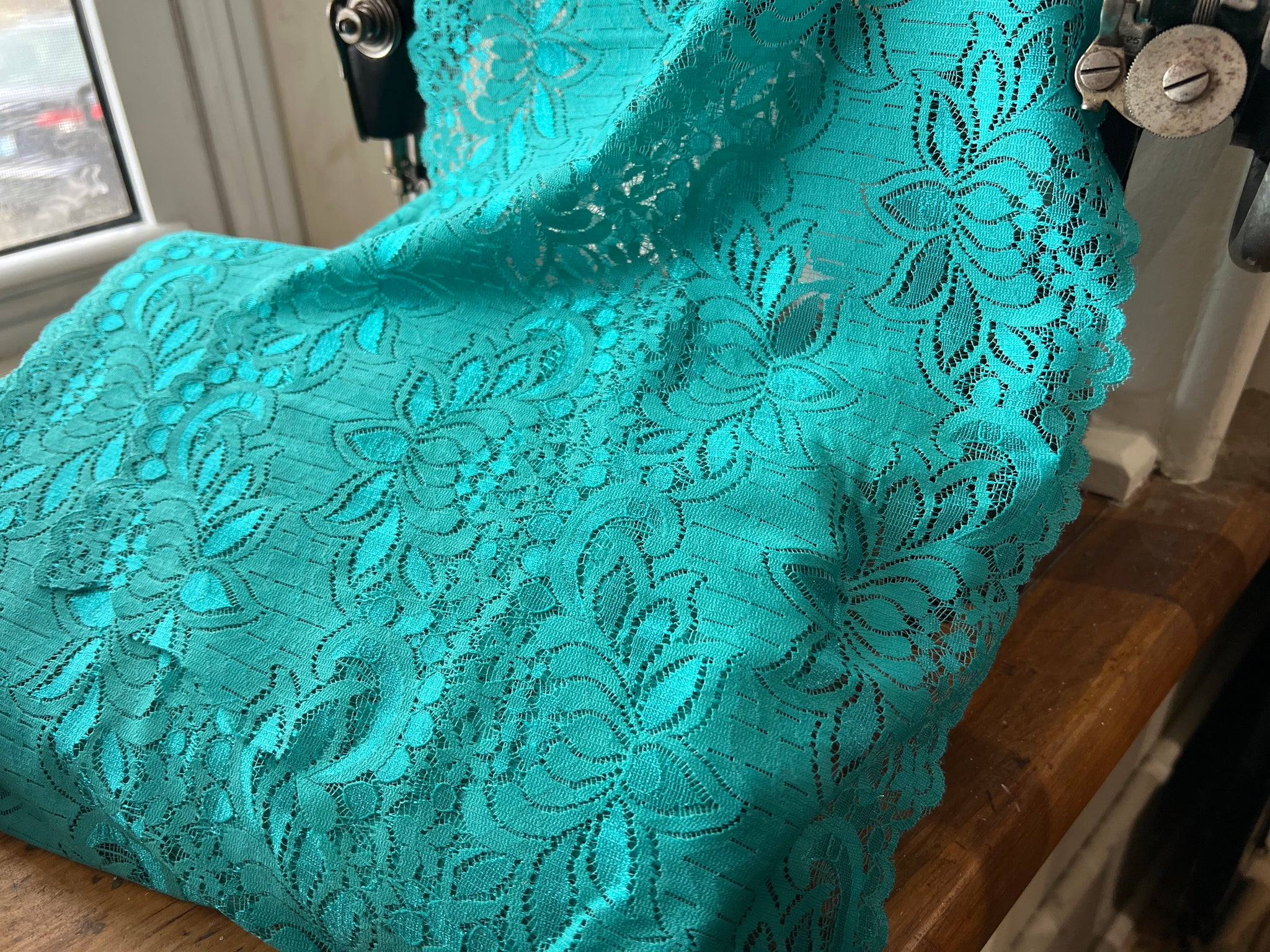 This Eleven & a Half Inch Turquoise Stretch Lace features a beautiful Floral design on a vibrant Turquoise background.
