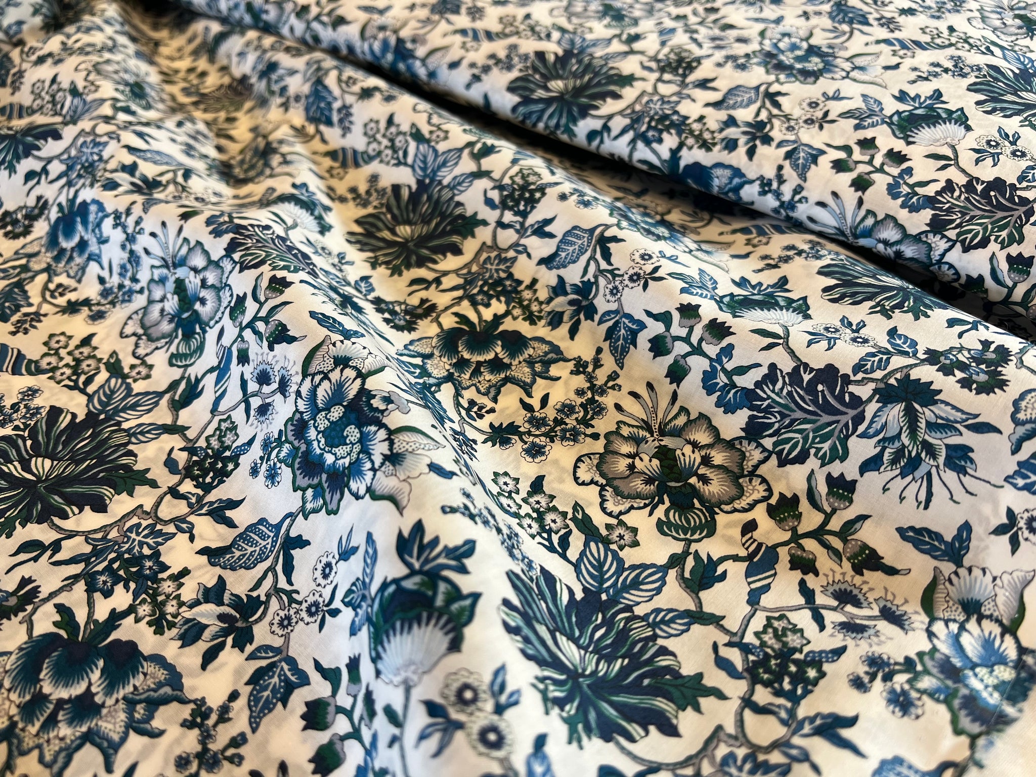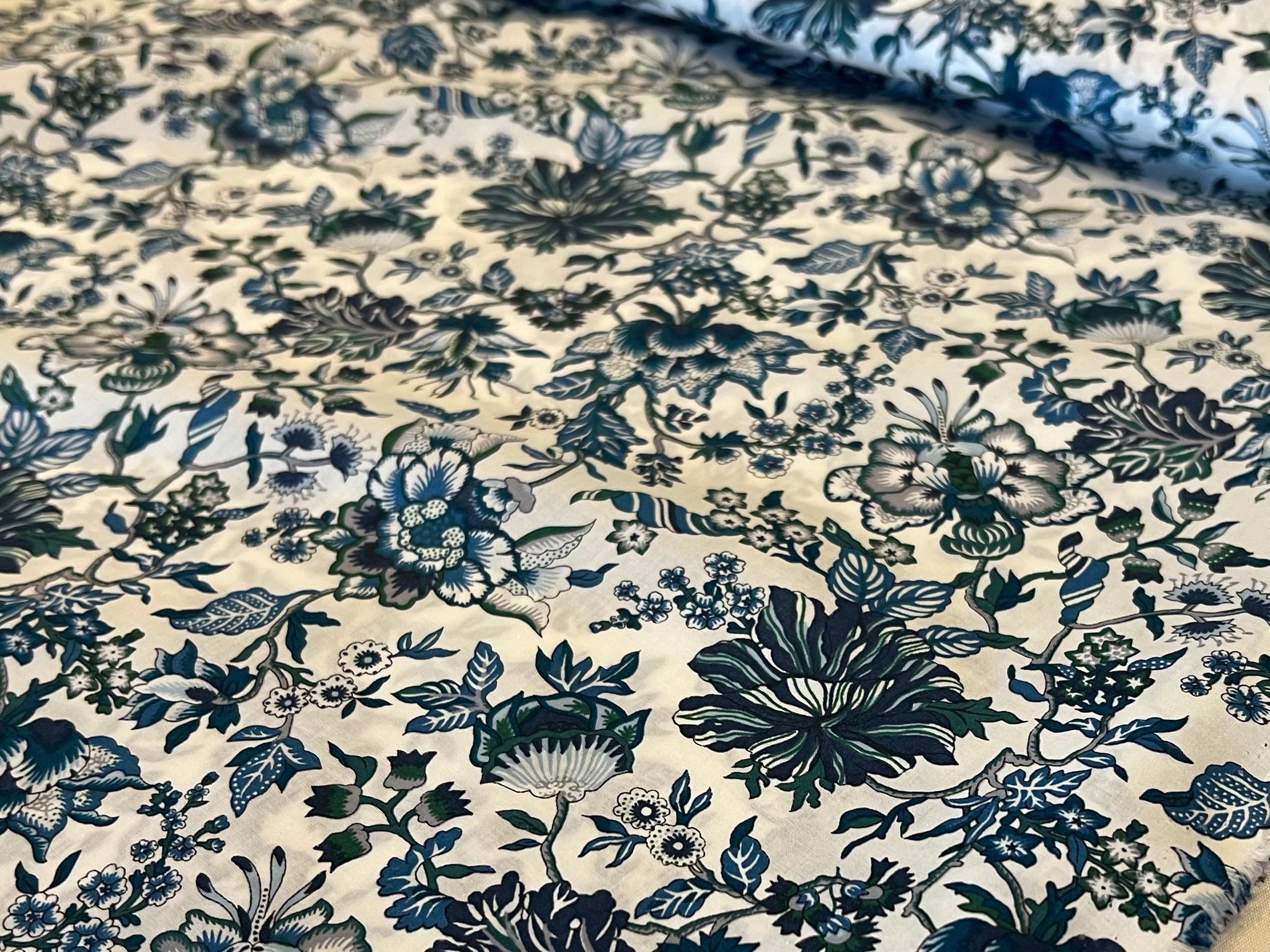 Christelle is a medium sized oriental floral trail with tree of life style flowers. These types of patterns are based o the early Indian chintzes that first came to Europe in the 17th Century. Christelle first appeared in Liberty Fabrics collections in the early 1990s as a furnishing fabric.