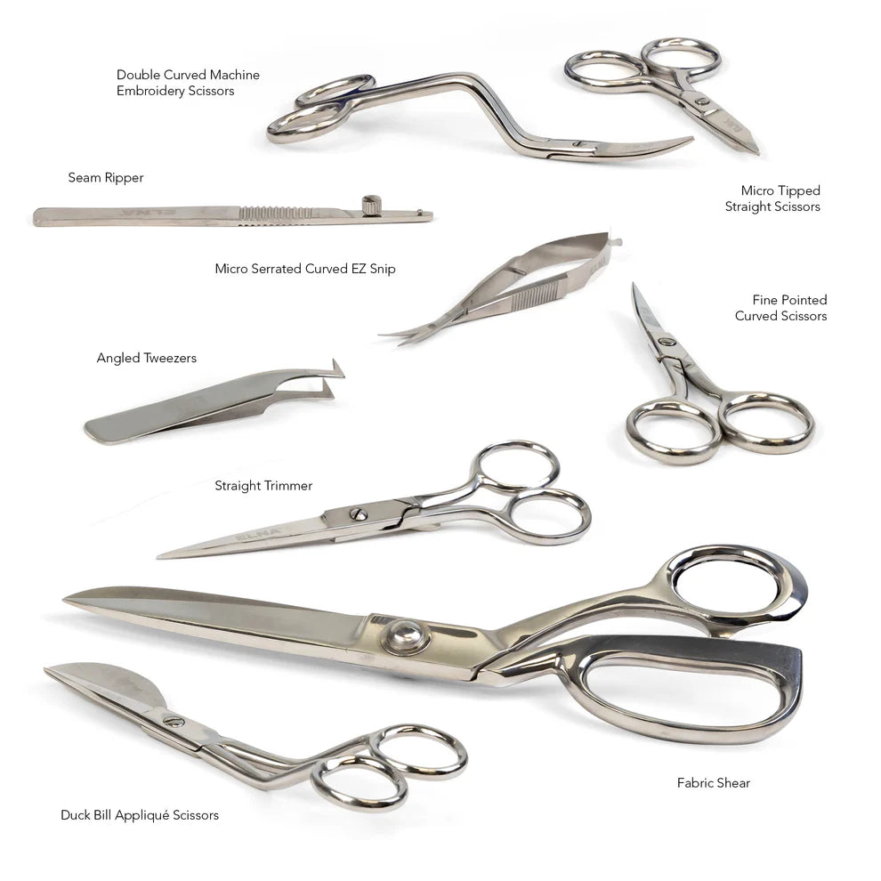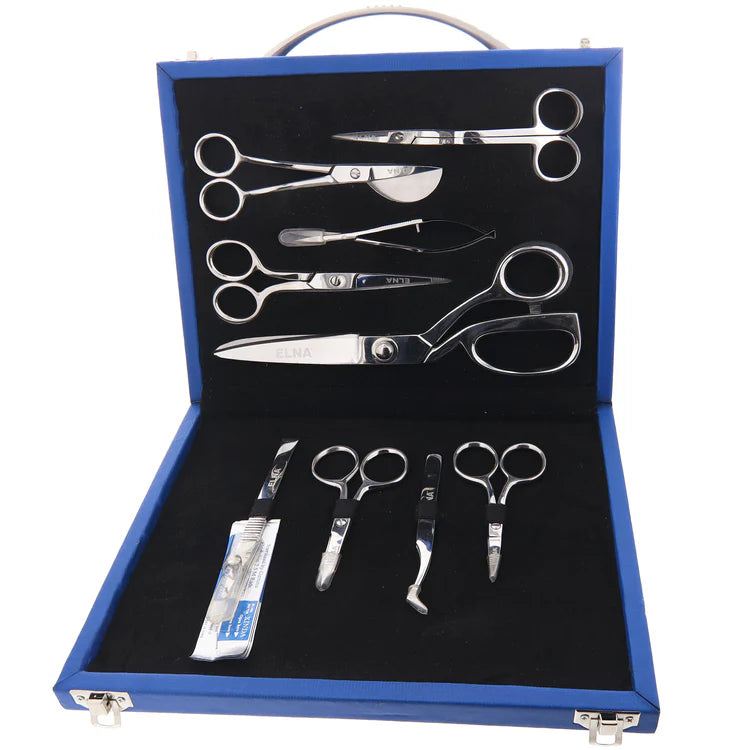 The Elna 9-piece Sewing & Embroidery Scissors Kit is a comprehensive set designed for precision and versatility in any sewing or embroidery project. This kit includes a variety of scissors, from sharp and fine-tipped embroidery scissors to larger, heavy-duty fabric shears, catering to different cutting needs.